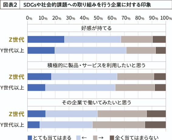 図表2は「SDGsや社会的課題への取り組みを行う企業に対する印象」について、Z世代とY世代以上の回答を比較したものです。回答を「好感が持てる」「製品・サービスを利用したいと思う」「働いてみたいと思う」の3つに分けたところ、Z世代はY世代以上よりもすべての項目で「とても当てはまる」の割合が高い結果となりました。このことからもSDGsへの関心の強さとともに、社会問題を「自分ごと」として捉えている意識が伺えます。